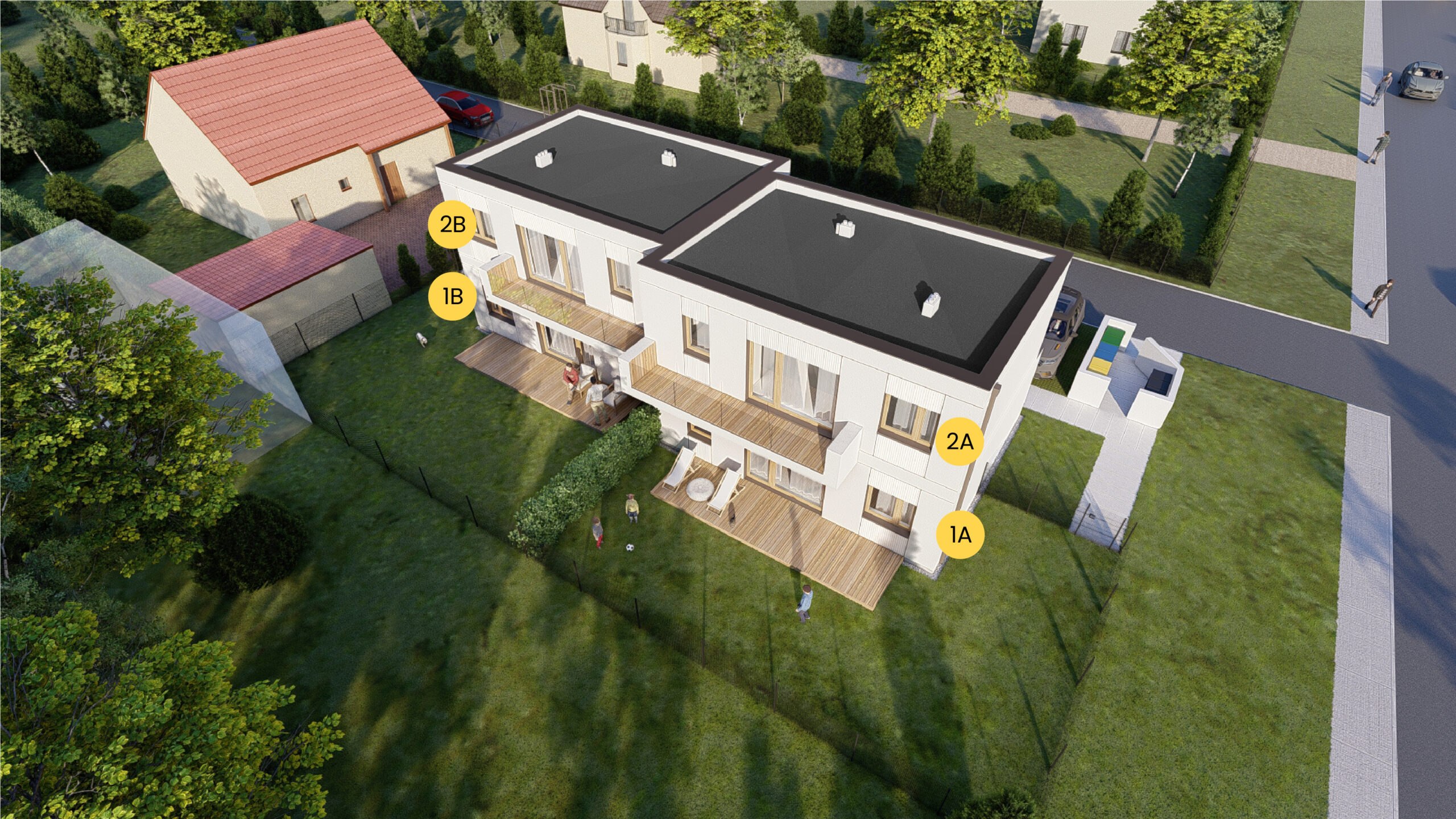 Apartamenty na parterze dysponują przydomowym ogródkiem z osobnym wyjściem, co daje Ci swobodę korzystania z zielonej przestrzeni tuż przy mieszkaniu. Natomiast lokale na piętrze oferują przestronny balkon oraz mały ogródek, który możesz zaaranżować jako miejsce na rowery, domek narzędziowy czy kącik zabaw dla dzieci. Cały teren inwestycji jest starannie zagospodarowany – chodniki wykonane są z kostki brukowej, a miejsca parkingowe z geokraty.