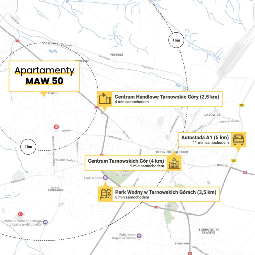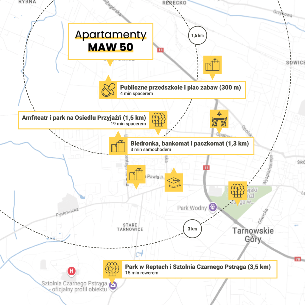 Apartamenty MAW 50 są zlokalizowane w pobliżu popularnych osiedli: Przyjaźń i Sielanka, co zapewnia dostęp do pełnej infrastruktury – sklepów, szkół i punktów usługowych, do których możesz wygodnie dojść pieszo. Bliskość zielonych terenów, takich jak Park w Reptach czy popularnych zabytków (np. Sztolnia Czarnego Pstrąga), pozwoli Ci wypełnić czas wolny ciekawymi aktywnościami. Ponadto okoliczne pola i łąki tworzą spokojną atmosferę, umożliwiając relaks na łonie natury bez oddalania się od miasta.